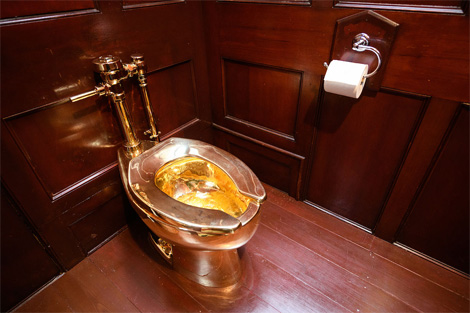 Chiếc bồn cầu này là tác phẩm của nghệ sĩ điêu khắc Italy nổi tiếng Maurizio Cattelan, cấu thành từ vàng nguyên khối 18 carats (1 carat = 0,2g) trị giá tương đương 6 triệu USD, được đặt tên là "America", hàm ý ám chỉ thành ngữ "Giấc mơ Mỹ".