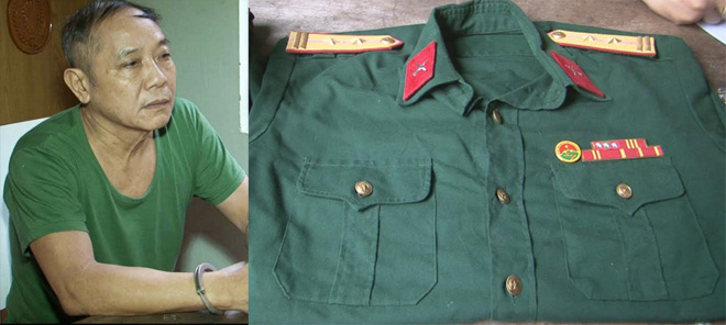 | Nguyễn Đại Dương và bộ quần áo quân đội đối tượng sử dụng để lừa đảo. |