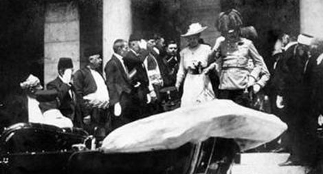 10 giờ kém 15 phút sáng chủ nhật, vợ chồng Thái tử Franz Ferdinand đến Sarajevo bằng tàu hỏa rồi chuyển sang xe hơi. Ngồi trong xe đầu tiên là Fehim Curcie, Thị trưởng thành phố Sarajevo và tiến sĩ Gerde, Ủy viên cảnh sát thành phố. Kế đó là xe hộ tống còn Thái tử Franz Ferdinand cùng bà Sophie ngồi ở xe thứ ba với tướng Oskar Potiorek và trung tá, Bá tước Franz von Harrach. 3 xe còn lại chở nhân viên an ninh chạy theo sau. Tất cả mui xe đều được cuộn lại để đám đông chào đón có thể nhìn rõ những người trong xe.