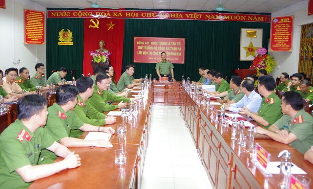 Phát biểu tại buổi làm việc, Thứ trưởng Lê Tấn Tới đánh giá cao, ghi nhận và biểu dương những kết quả, thành tích mà Công an hai huyện Đồng Văn và Mèo Vạc đã đạt được trong thời gian qua. Đồng chí nhấn mạnh: trong thời gian tới, các đơn vị tiếp tục nắm chắc tình hình, tham mưu kịp thời cho cấp ủy, chính quyền địa phương trong công tác đảm bảo ANTT gắn với phát triển kinh tế; luôn chủ động trong mọi tình huống; đối với lực lượng Công an xã chính quy phải luôn bám dân, gần dân, sát dân và hiểu dân hơn nữa; lãnh đạo Công an huyện phải quan tâm một cách toàn diện đối với lực lượng Công an xã; giữ gìn và phát huy truyền thống đơn vị Anh hùng lực lượng vũ trang nhân dân, đoàn kết toàn diện, đảm bảo an ninh du lịch, cán bộ chiến sĩ nghiêm túc chấp hành điều lệnh, mệnh lệnh, hoàn thành tốt mọi nhiệm vụ được giao.