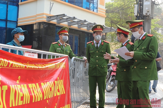 | Đại úy Nguyễn Mạnh Dũng, Phó Trưởng Công an phường Trúc Bạch kiểm tra các chốt làm nhiệm vụ tại khu vực cách ly. Ảnh: Xuân Trường. |