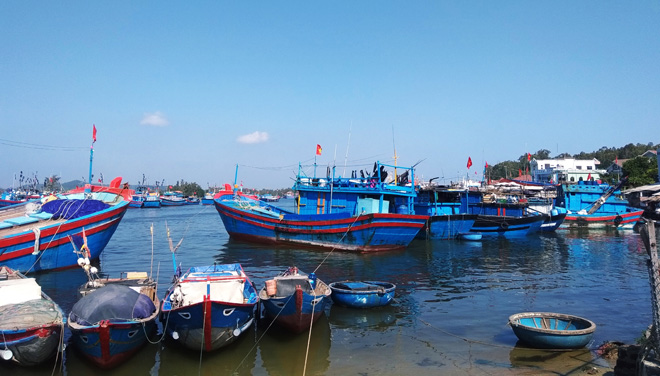 | Nhiều tàu cá tại cảng Sa Kỳ, xã Bình Châu vẫn phải nằm bờ vì thiếu lao động. |